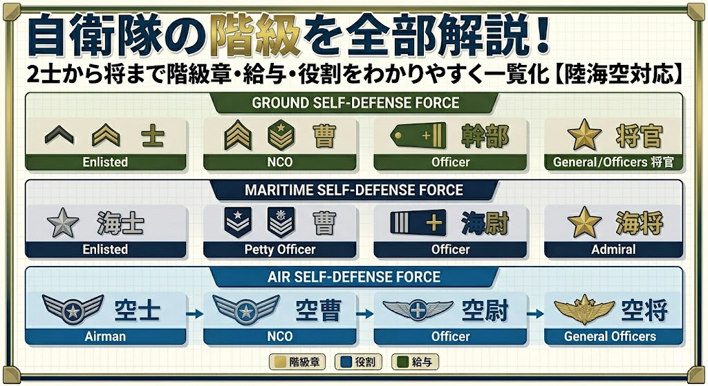 自衛隊の全16階級を徹底解説。2士から将まで、陸海空の呼称・階級章・俸給月額・定年年齢・昇進ルートを一覧表付きでわかりやすく紹介。2025年12月の給与法改正や階級名変更の最新動向も網羅。 -