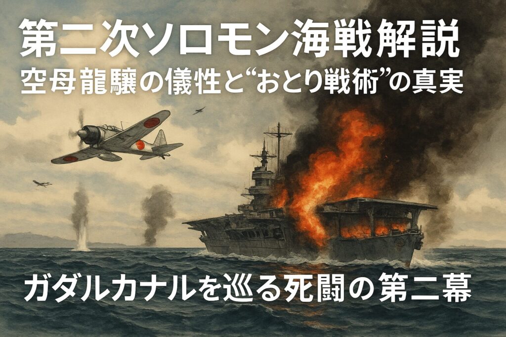 第二次ソロモン海戦を徹底解説。空母龍驤の沈没、翔鶴・瑞鶴の反撃、ガダルカナル増援失敗の真相。1942年8月、日本海軍の限界が見え始めた歴史的敗北をわかりやすく語ります。