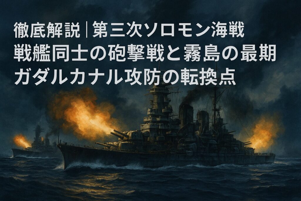 第三次ソロモン海戦を完全解説。1942年11月、ガダルカナル島を巡る死闘で戦艦比叡・霧島が沈んだ3日間の激戦。夜戦の詳細から敗因、人物まで初心者向けにわかりやすく語ります。 -