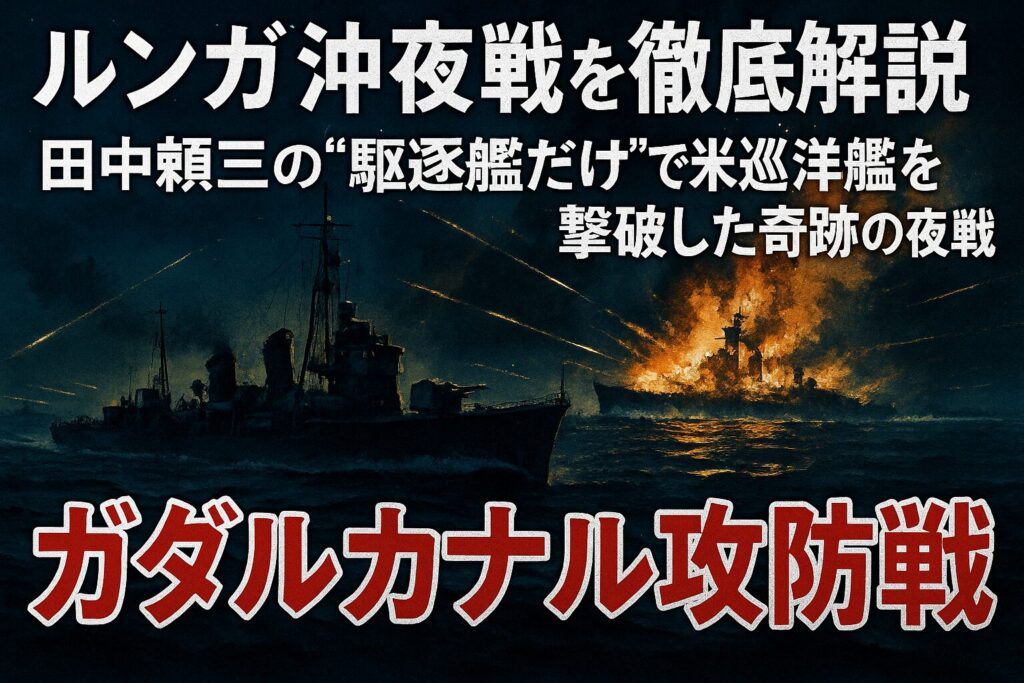 ルンガ沖夜戦(タサファロング沖海戦)を完全解説。1942年11月30日、田中頼三少将率いる駆逐艦8隻が米巡洋艦部隊を撃破した奇跡の夜戦。酸素魚雷の威力、戦術、敗因、ガダルカナルへの影響まで徹底分析。 -