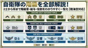 結婚生活の安定度は、夫の階級と将来の昇任見込みで大きく変わる。同じ自衛官でも二士と幹部では年収に3倍の差がつく。相手の現在の階級と昇任ルートは交際段階で理解しておきたい。階級体系の全体像は自衛隊階級完全解説|陸海空の位階と階級章を一発理解で把握できる。