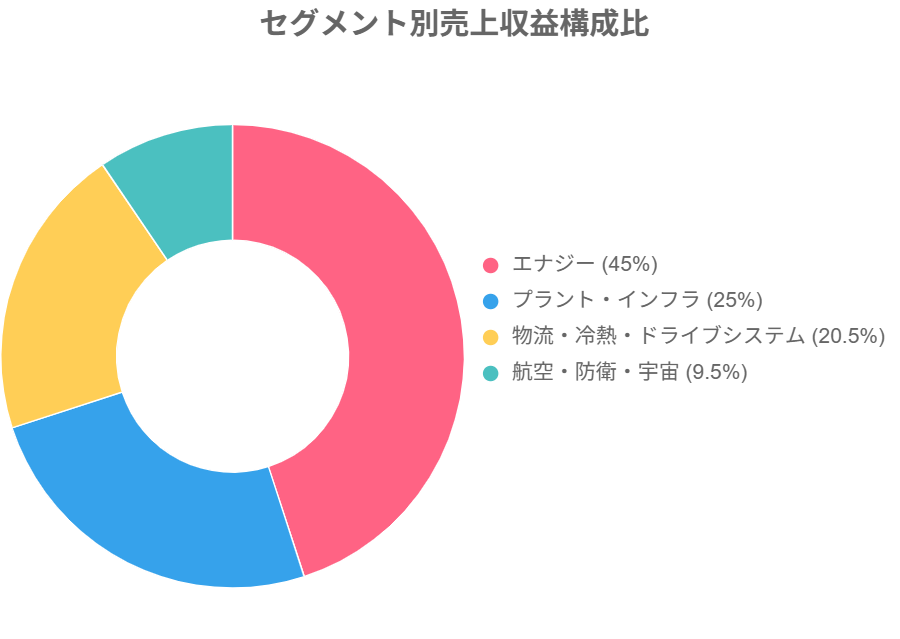 三菱重工の事業は、主に4つのセグメントに分かれています:エナジー、プラント・インフラ、物流・冷熱・ドライブシステム、そして航空・防衛・宇宙。2025年3月期の決算では、全体売上収益が5兆271億円で、そのうち航空・防衛・宇宙セグメントは約5,000億円(構成比約9.5%)を占めました。これは前年比で増加傾向で、防衛費増が後押ししています。