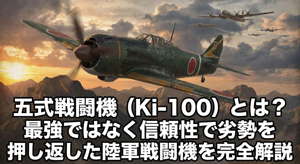 大日本帝国の五式戦闘機(Ki-100)を総解説。飛燕(Ki-61)からの転身、ハ112-II空冷化の狙い、中低高度での操縦性と再加速、本土防空での運用、疾風・飛燕・紫電改・P-51との比較、展示・プラモデル・ゲームTipsまで。 -